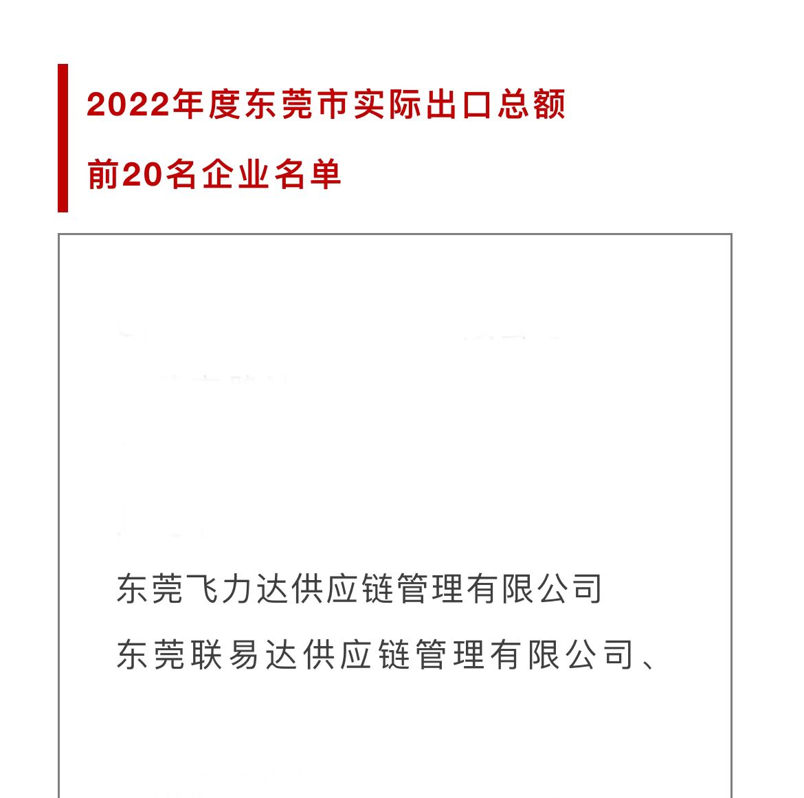 2023年2月24日,在東莞市2022年度工作總結(jié)大會(huì)上,飛力達(dá)旗下子公司東莞飛力達(dá)供應(yīng)鏈管理有限公司和東莞聯(lián)易達(dá)供應(yīng)鏈管理有限公司獲得2022年度東莞市實(shí)際出口總額前20名企業(yè)。